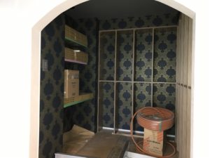 ↓収納棚たっぷり、クロス使いが素敵なホビースペース。
