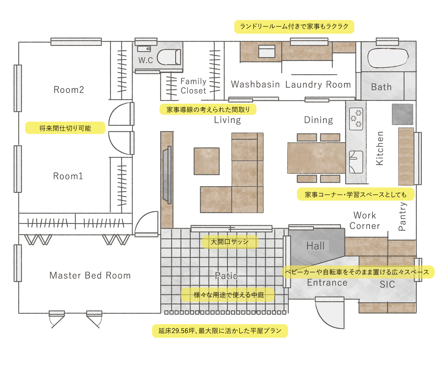 エアコン1台で家中どこにいても心地いい、身体に優しい室内環境。 家事動線をギュッと凝縮し、子育ての「いま」を楽しく、将来の暮らしをずっと楽にする、賢い平屋の暮らしを体感しませんか?