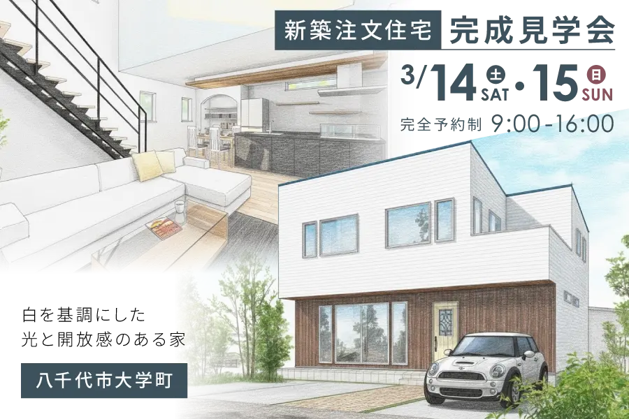 【新築注文住宅|完成見学会】3/14(土)15(日)|白を基調にした光と開放感のある家|八千代市大学町