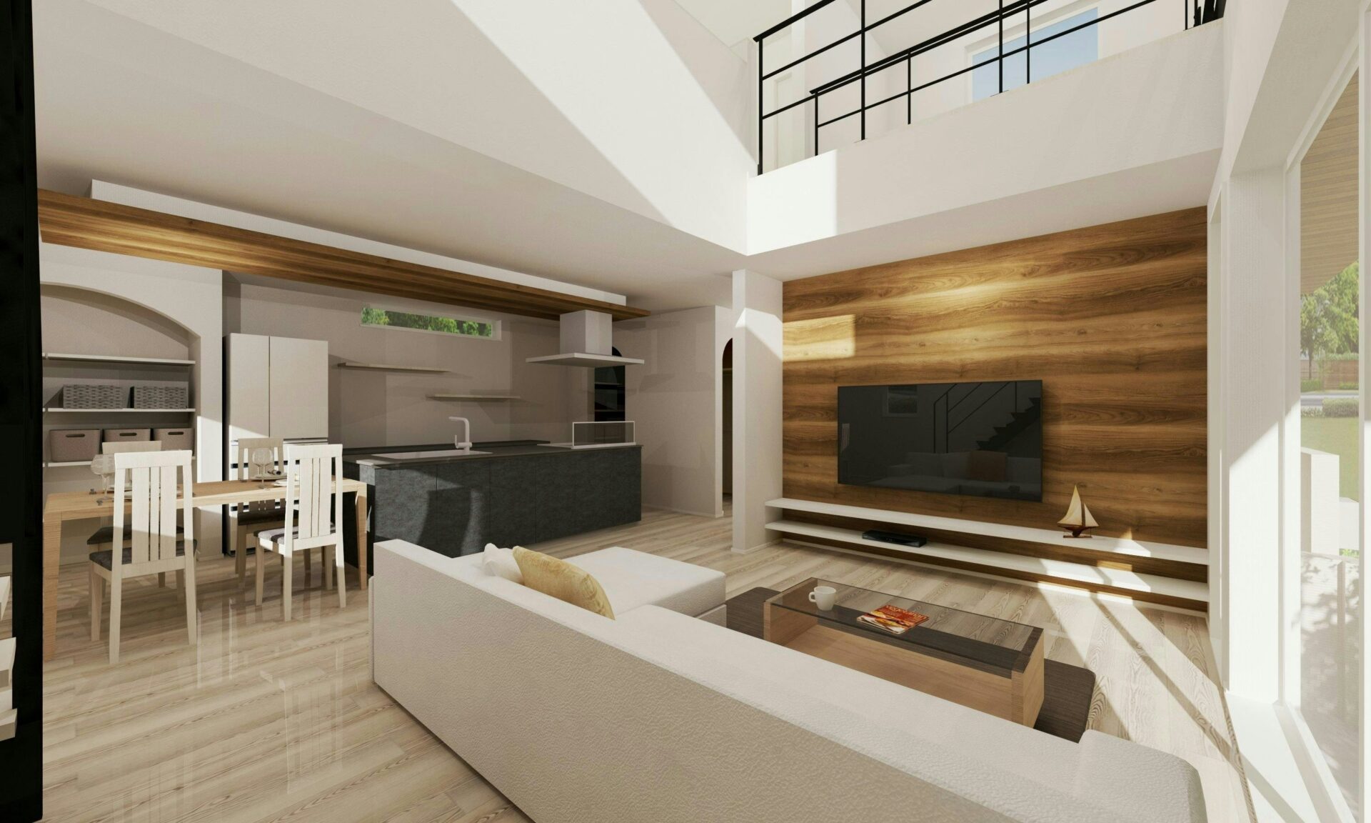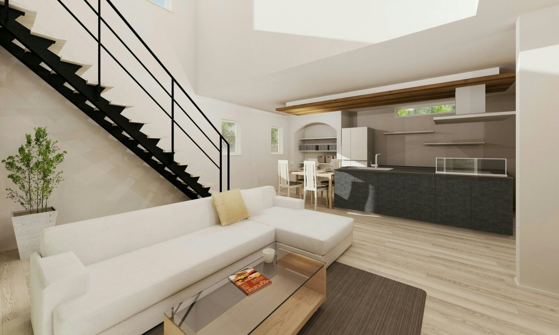 デザイン階段が視線の広がりをつくり、LDKに軽やかな印象をプラス。
