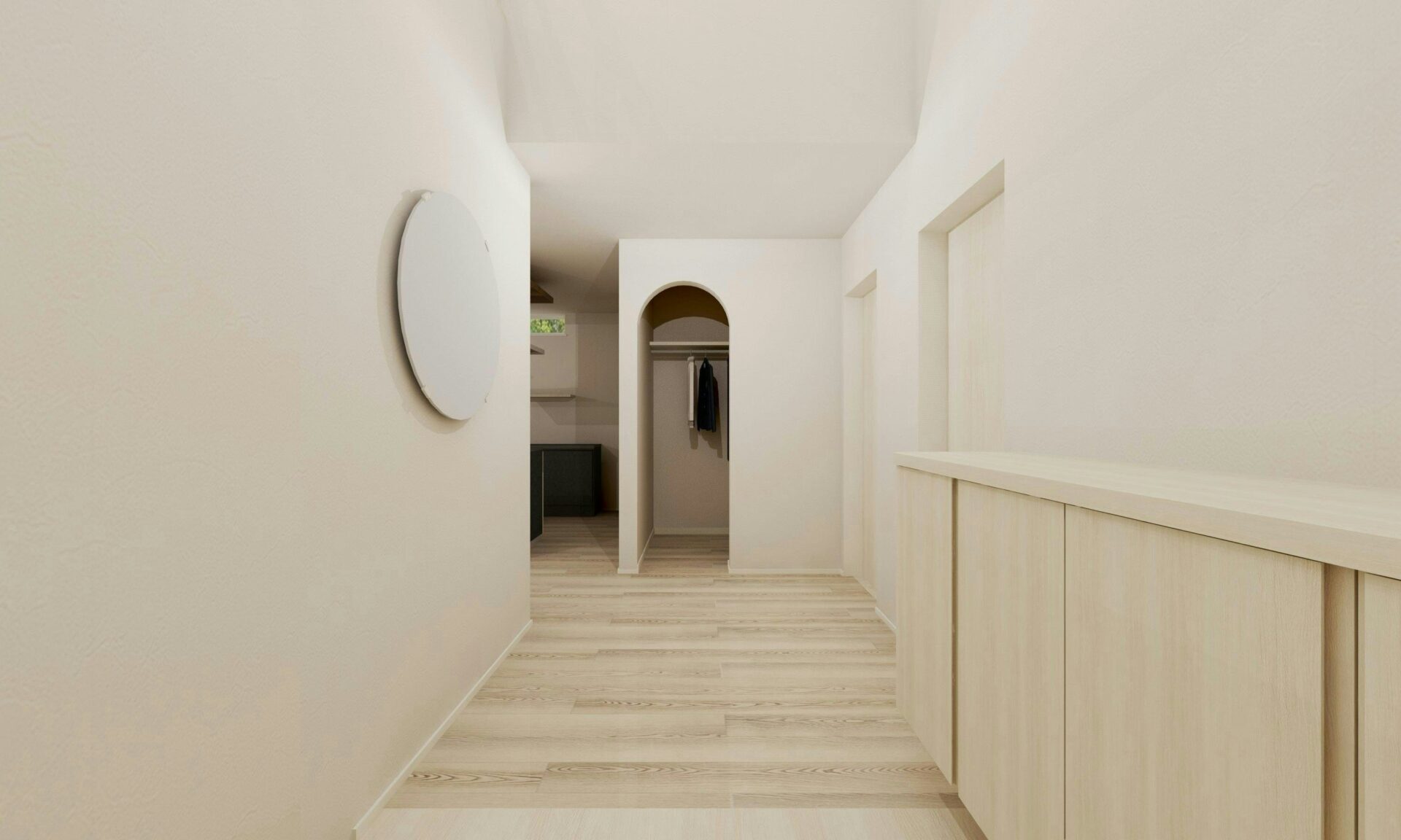玄関からLDKへ向かう動線の中で、ほどよい“抜け”と開放感が感じられる設計。