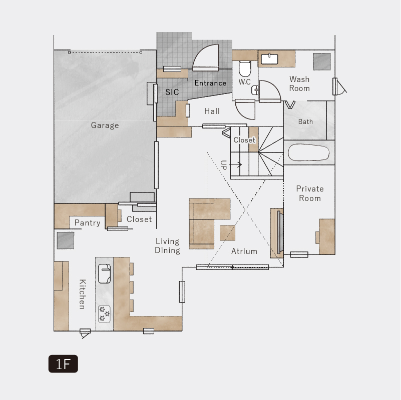 ガレージからシューズインクローク、ガレージからキッチン、と2方向から出入りできるプラン。リビングからガーレジが見える、大開口FIX窓があります。