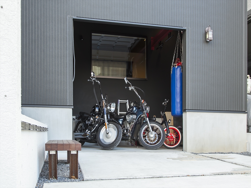 こだわりのガレージは、バイク3台を収納できるだけでなく、トレーニングルームや夫人の趣味であるDIYの作業スペースとしても使える空間に。